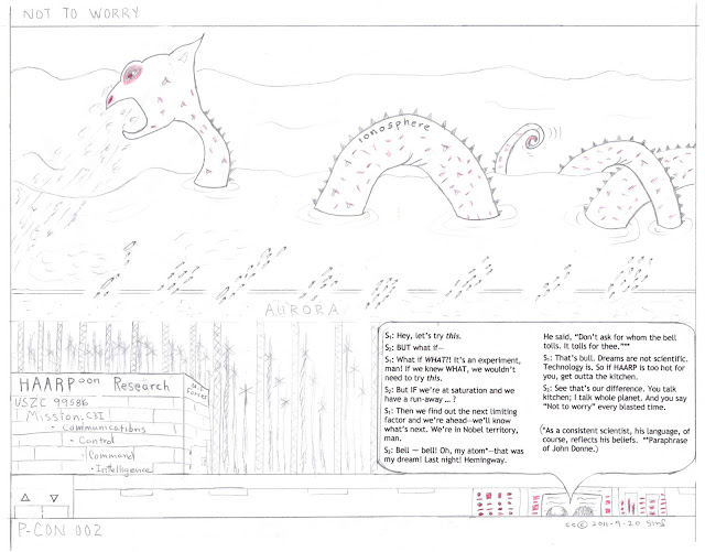 All quotes following this P-Con sketch-story are from Angels Don’t Play This Haarp: Advances in Tesla Technology by Dr. Nick Begich and Jeane Manning © 1995, 2002 Earth Press, Anchorage, Alaska. This HAARP U.S. government/corporate partnership story is a classic (déjà vu) P-Con. It’s time to give ear to concerned scientists like S2.