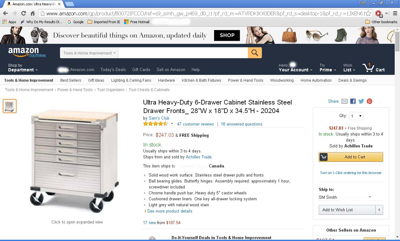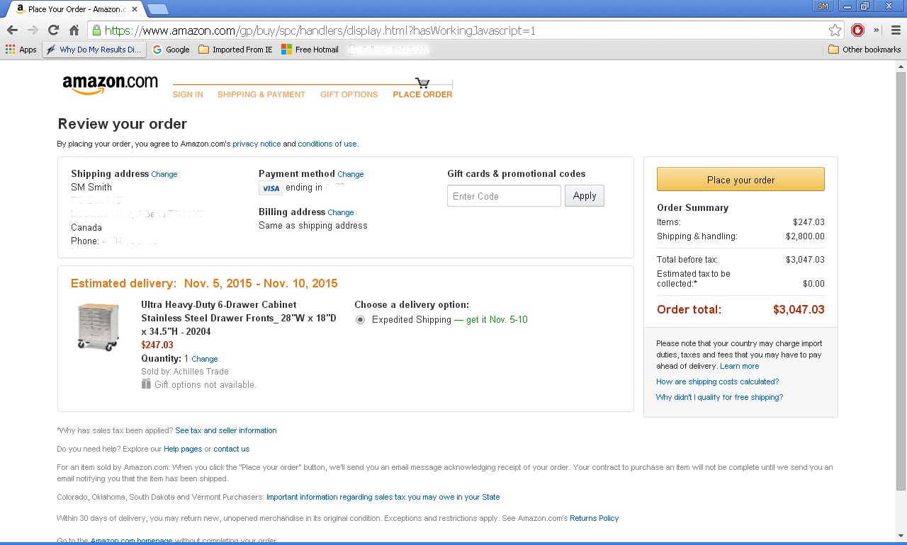 This isn’t the first time “foreigners” have encountered AMAZing S&H assessments just to cross a border, but so far (for us) this S&H takes the cake. It’s free shipping to any nearby U.S. border town, BUT (apparently) $2,800.00 USD to get my $247.03 item 15 miles further north to me.